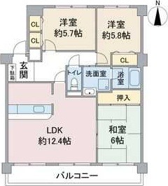 | 間取り詳細 | 和室 6畳 、 洋室 5.7畳 、 洋室 5.8畳 、 LDK 12.4畳 |