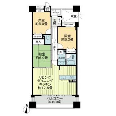 | 間取り詳細 | 和室 6畳 、 洋室 6畳 、 洋室 6畳 、 LDK 17.8畳 |