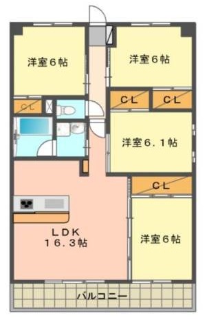 洋室 6畳 洋室 6.1畳 洋室 6畳 LDK 16.3畳 |