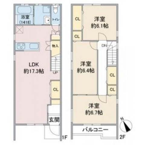 間取り詳細 | 洋室 6.7畳 、 洋室 6.4畳 、 洋室 6.1畳 、 LDK 17.3畳 |