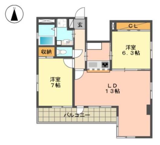| 間取り詳細 | 洋室 7畳 、 洋室 6.3畳 、 LD 13畳 |