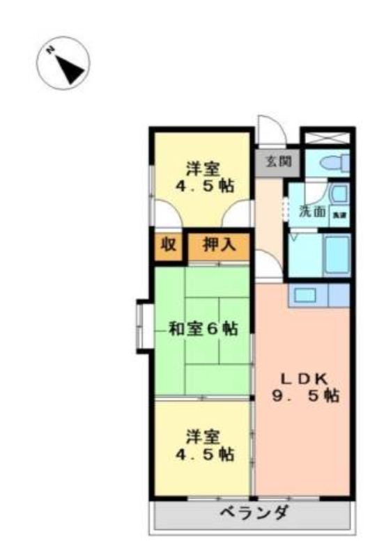 | 間取り詳細 | 和室 6畳 、 洋室 4.5畳 、 洋室 4.5畳 、 LDK 9.5畳 |