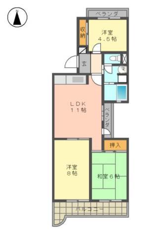 | 間取り詳細 | 和室 6畳 、 洋室 8畳 、 洋室 4.5畳 、 LDK 11畳 |