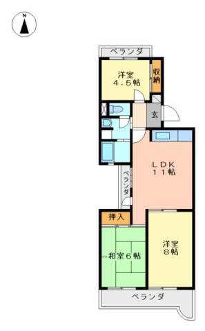 | 間取り詳細 | 和室 6畳 、 洋室 8畳 、 洋室 4.5畳 、 LDK 11畳 |