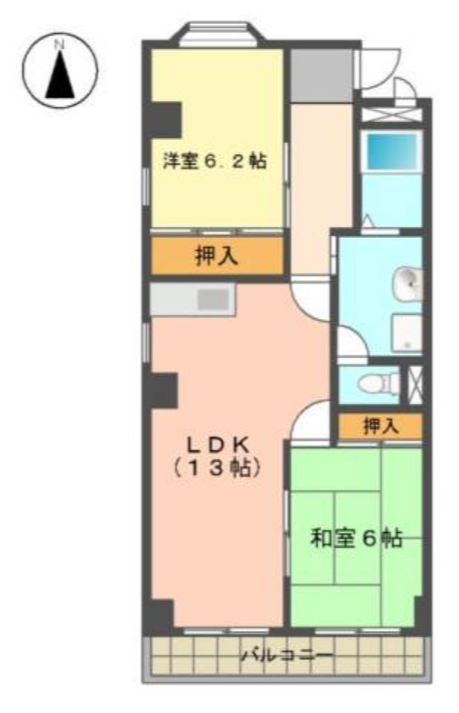 | 間取り詳細 | 和室 6畳 、 洋室 6.2畳 、 LDK 13畳 |