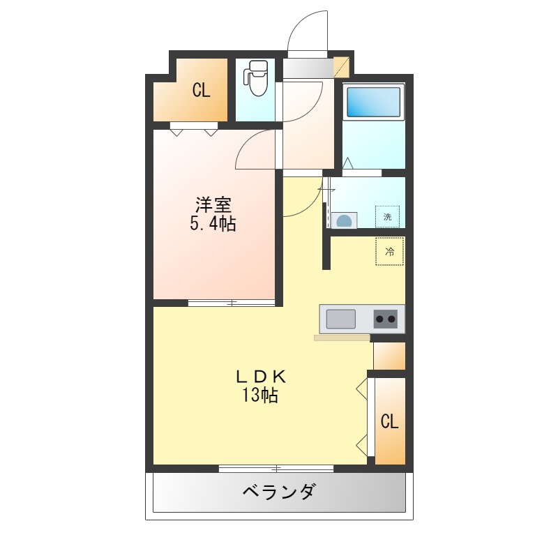 | 間取り詳細 | LDK 13畳 、 洋室 5.4畳 |