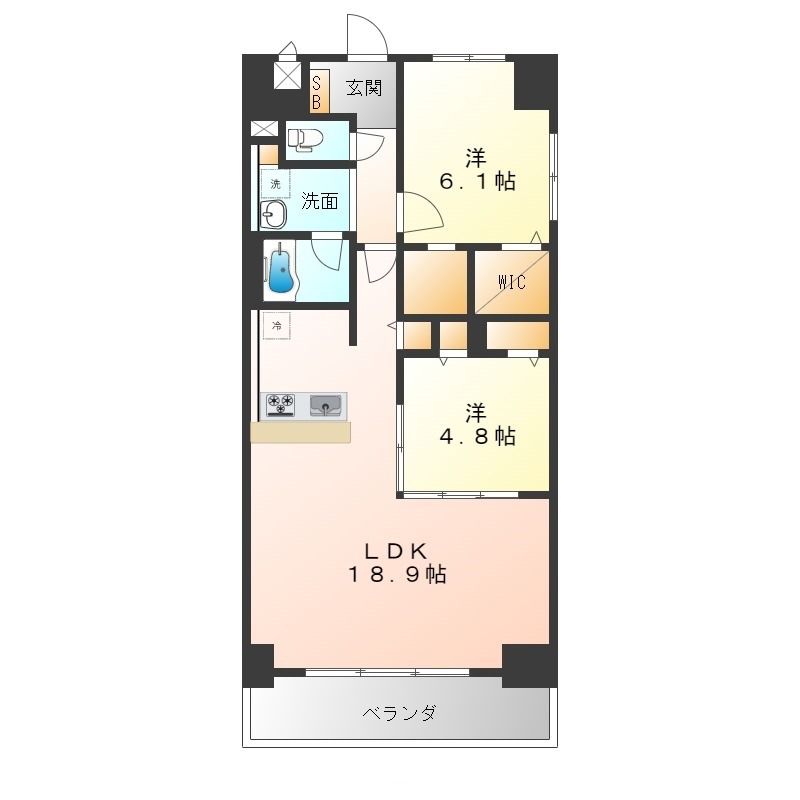 | 間取り詳細 | LDK 18.9畳 、 洋室 6.1畳 、 洋室 4.8畳 |