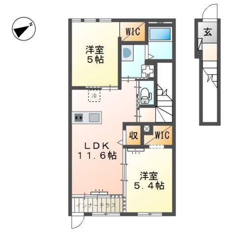| 間取り詳細 | LDK 11.6畳 、 洋室 5.4畳 、 洋室 5畳 |