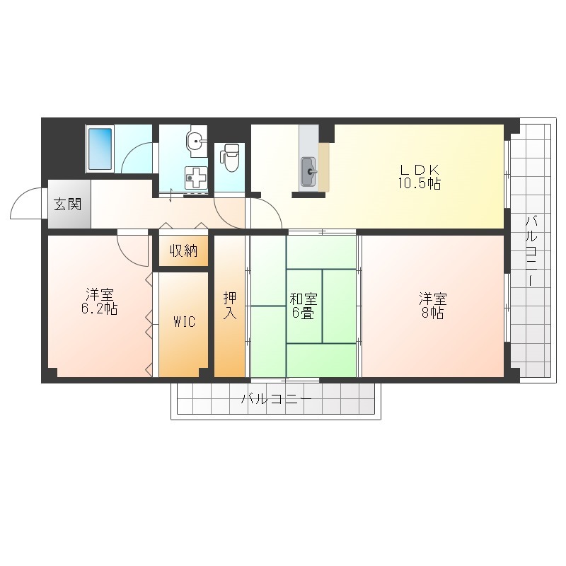 | 間取り詳細 | 洋室 8畳 、 和室 6畳 、 洋室 8畳 、 LDK 10.5畳 |