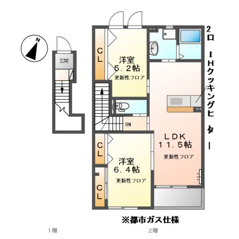 | 間取り詳細 | LDK 11.5畳 、 洋室 6.4畳 、 洋室 5.2畳 |