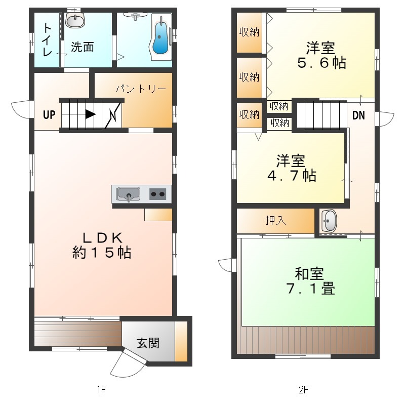 | 間取り詳細 | 和室 7.1畳 、 洋室 4.7畳 、 洋室 5.6畳 、 LDK 15畳 |