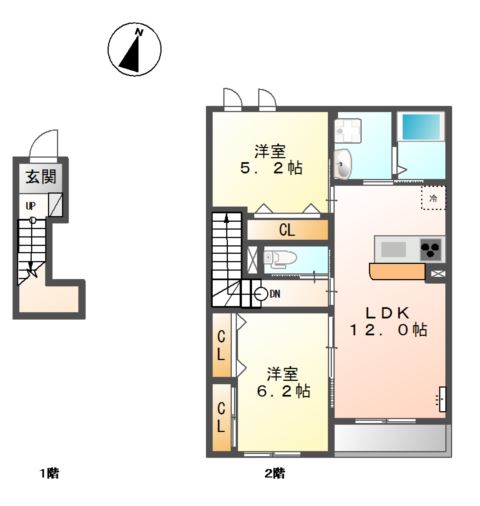 | 間取り詳細 | LDK 12畳 、 洋室 6.2畳 、 洋室 5.2畳 |