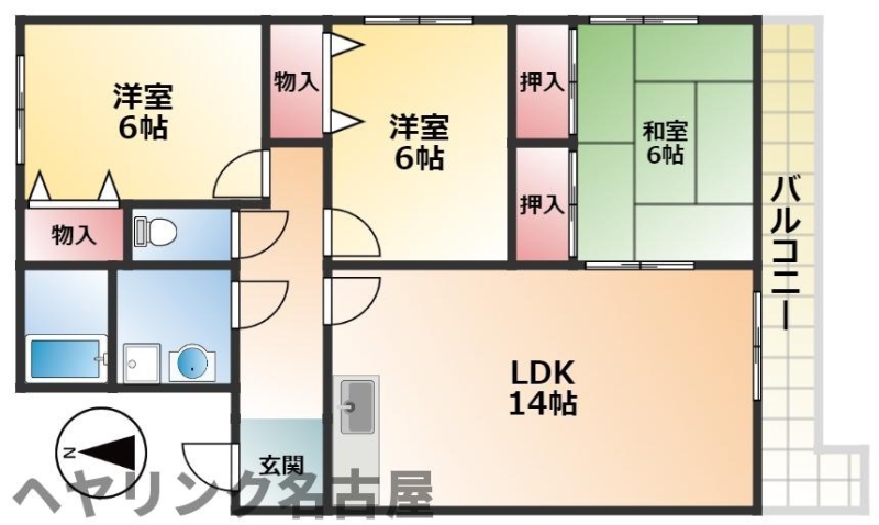 | 間取り詳細 | LDK 14畳 、 洋室 6畳 、 洋室 6畳 、 和室 6畳 |
