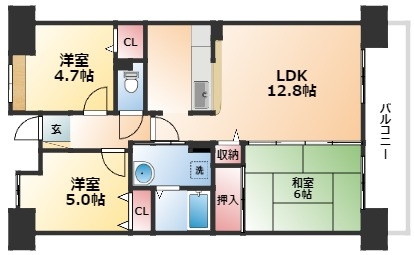| 間取り詳細 | LDK 12.8畳 、 洋室 5畳 、 洋室 4.7畳 、 和室 6畳 |