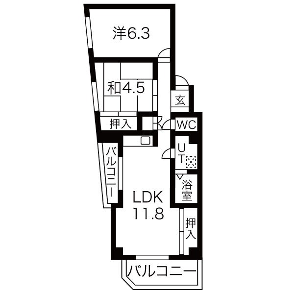 | 間取り詳細 | LDK 11.8畳 、 洋室 6.3畳 、 和室 4.5畳 |