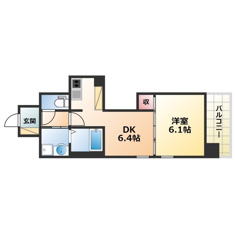 | 間取り詳細 | DK 6.4畳 、 洋室 6.1畳 |