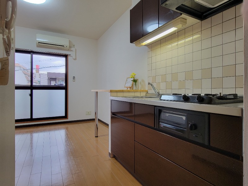 ガス(都市ガス)、管理形態(巡回)、オートロック、クローゼット、クローゼット数(1)、バス・トイレ別(別室)、脱衣所、洗面所独立、洗面所にドア、洗濯機置き場(室内)、コンロ設置済、コンロ口数(2)、コンロ種類(都市ガス)、システムキッチン、エアコン、エアコン台数(1)、CATV |