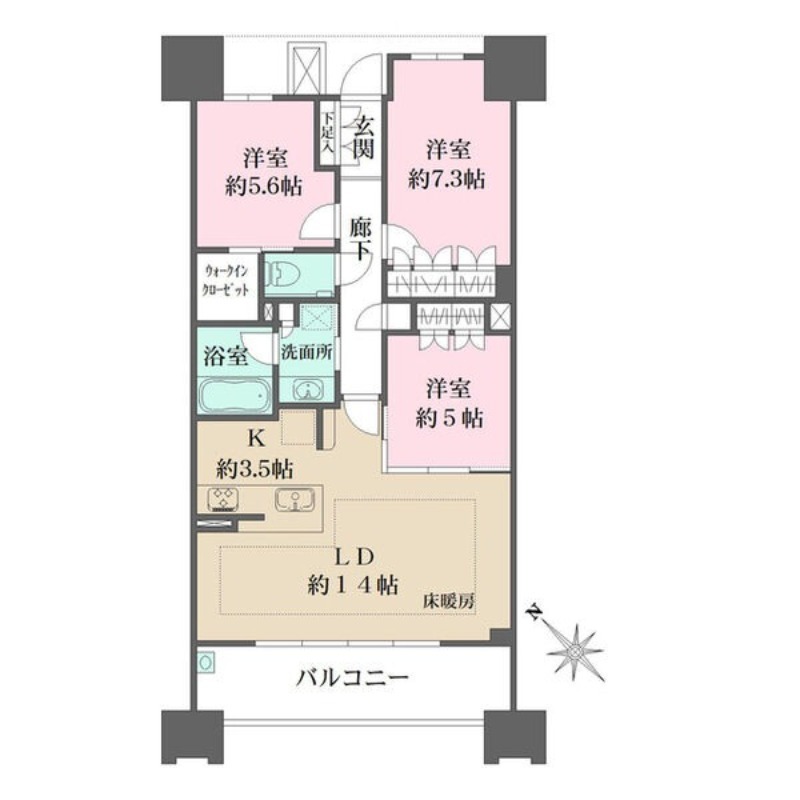 | 間取り詳細 | 洋室 5畳 、 洋室 5.6畳 、 洋室 7.3畳 、 LD 14畳 、 K 3.5畳 |