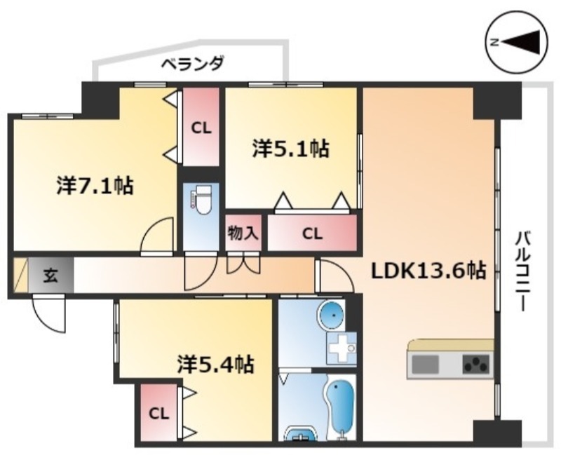 | 間取り詳細 | LDK 13.6畳 、 洋室 7.1畳 、 洋室 5.4畳 、 洋室 5.1畳 |
