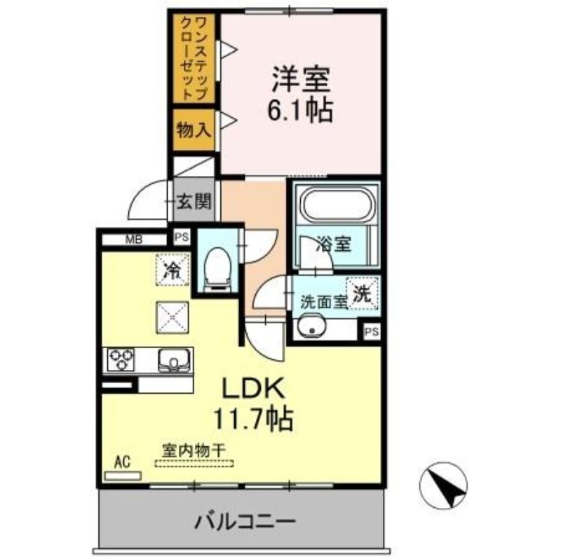 | 間取り詳細 | LDK 11.7畳 、 洋室 6.1畳 |