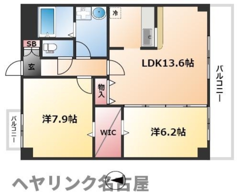 | 間取り詳細 | LDK 13.6畳 、 洋室 7.9畳 、 洋室 6.2畳 |