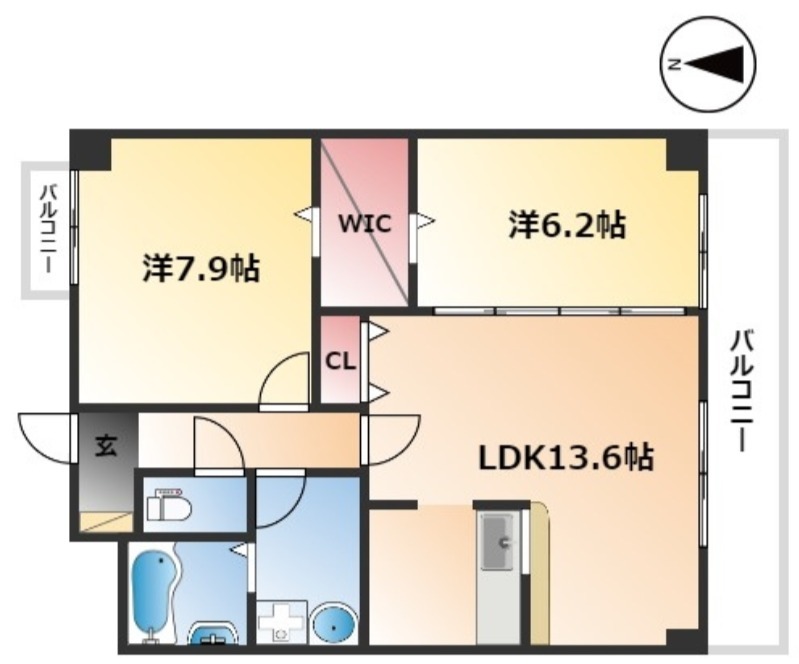 | 間取り詳細 | LDK 13.6畳 、 洋室 7.9畳 、 洋室 6.2畳 |