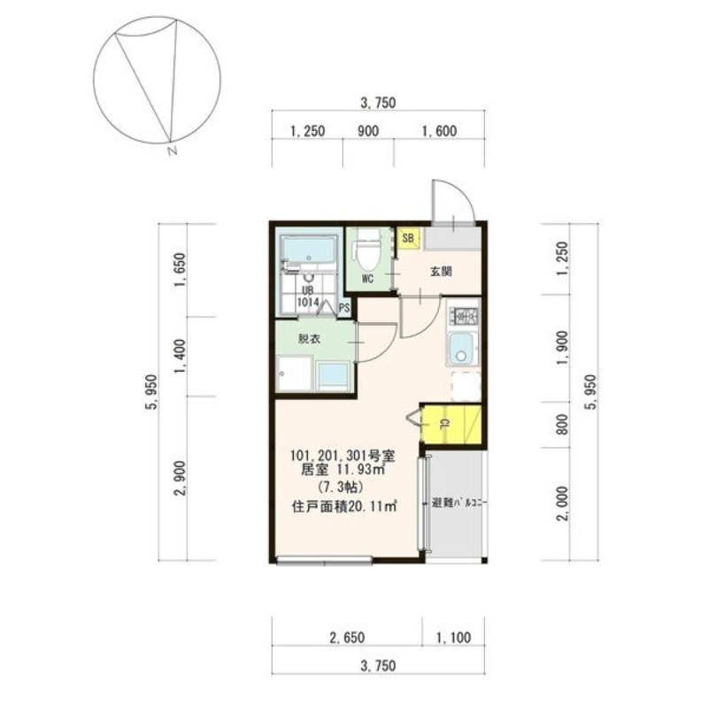 | ワンルーム | 洋室 7.3畳 | 20.11㎡ |