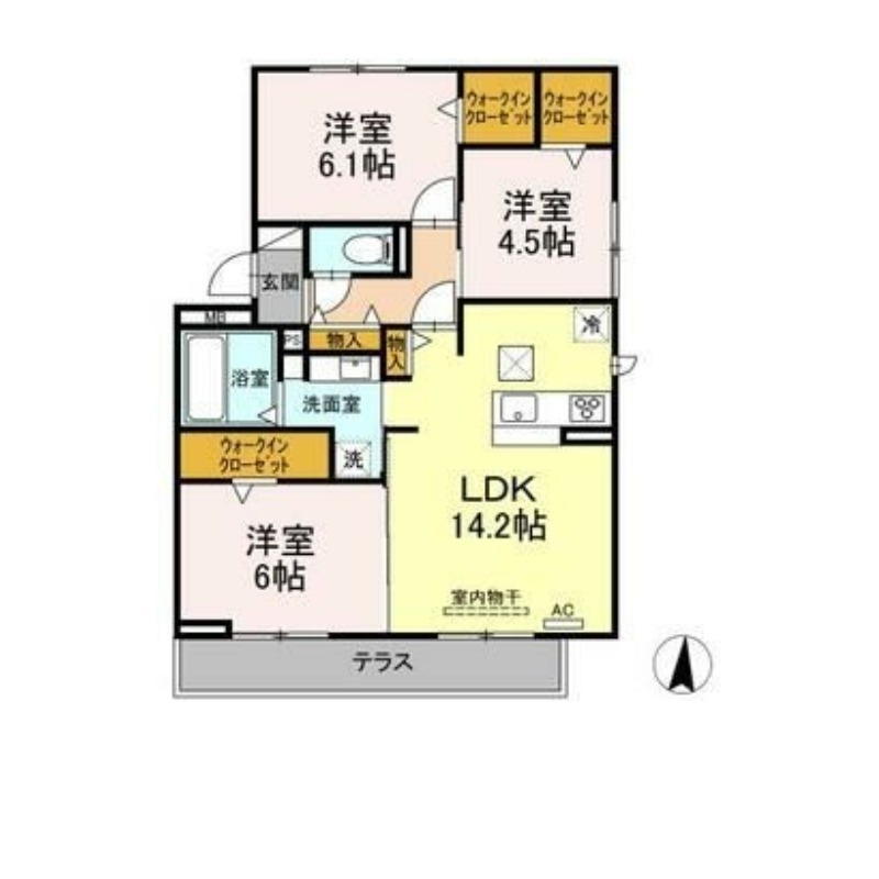 | 間取り詳細 | LDK 14.2畳 、 洋室 4.5畳 、 洋室 6.1畳 、 洋室 6畳 |