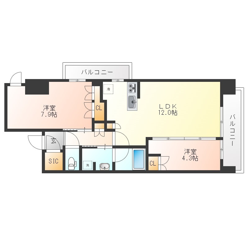 | 間取り詳細 | LDK 12畳 、 洋室 7.9畳 、 洋室 4.3畳 |