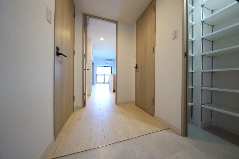 新築、駐車場有、エレベーター、ペット相談、防犯カメラ、オートロック、宅配ボックス、角部屋、フローリング、バストイレ別、シューズインクロゼット、浴室乾燥機、温水洗浄便座、シャンプードレッサー
