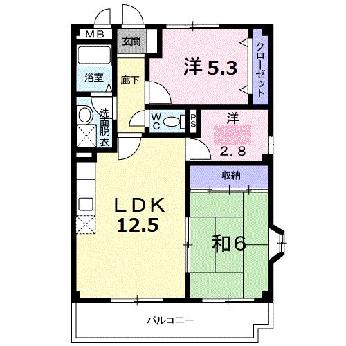 | 間取り詳細 | 和室 6畳 、 洋室 5.3畳 、 S 2.8畳 、 LDK 12.5畳 |