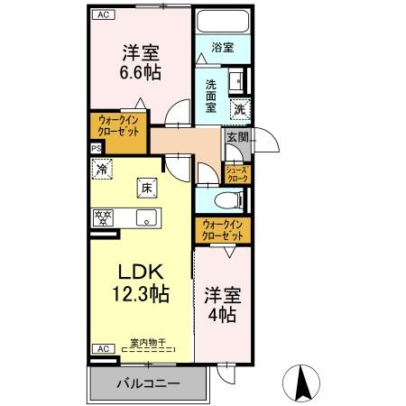 | 間取り詳細 | 洋室 6.6畳 、 洋室 4畳 、 LDK 12.3畳 |