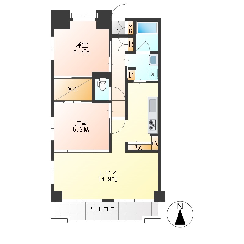 | 間取り詳細 | LDK 14.9畳 、 洋室 5.9畳 、 洋室 5.2畳 |