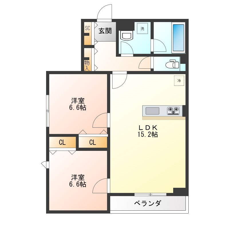 | 間取り詳細 | 洋室 6.6畳 、 洋室 6.6畳 、 LDK 15.2畳 |