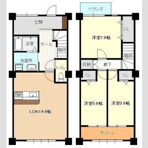 | 間取り詳細 | LDK 14.8畳 、 洋室 7.8畳 、 洋室 5.6畳 、 洋室 5.6畳 、 S 3.3畳 |