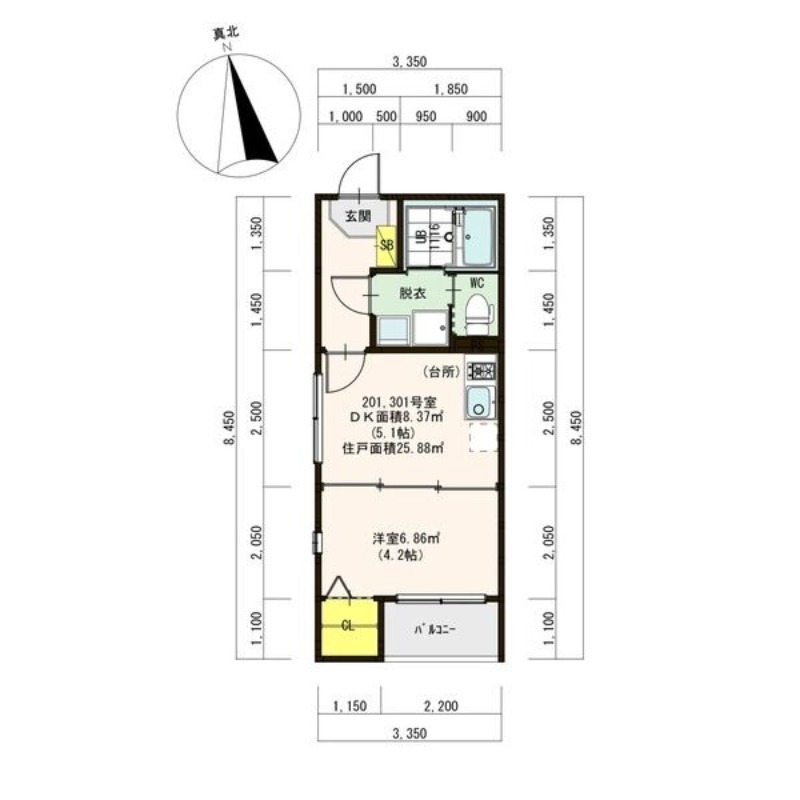 | 間取り | 1DK | 面積 | 25.88㎡ |
