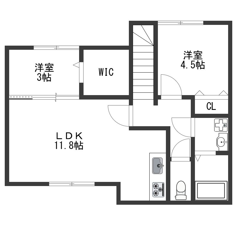 | 間取り詳細 | LDK 11.8畳 、 洋室 4.5畳 、 洋室 3畳 |