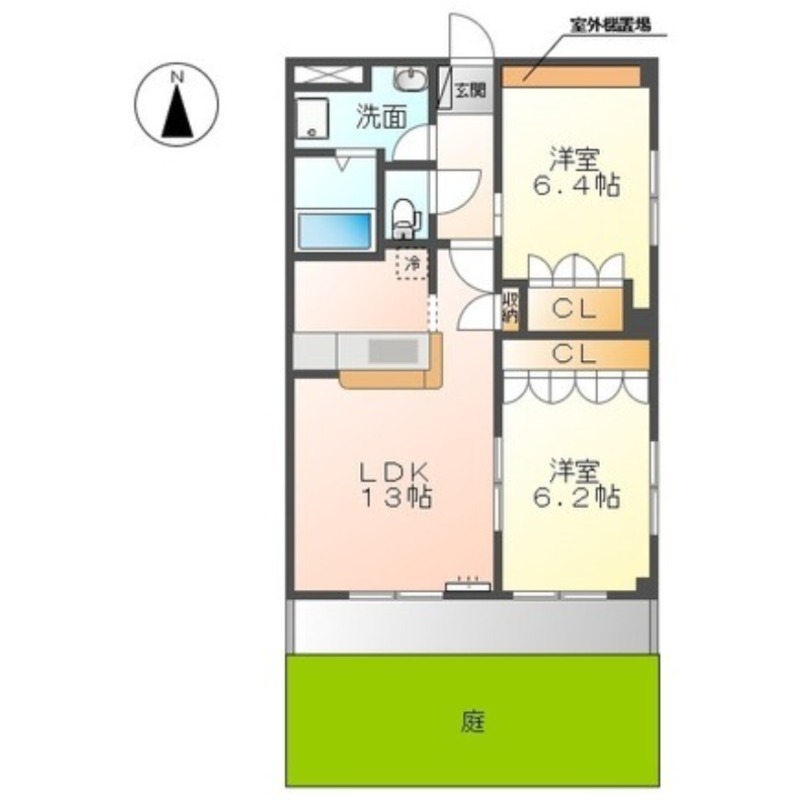 | 間取り詳細 | LDK 13畳 、 洋室 6.4畳 、 洋室 6.2畳 |