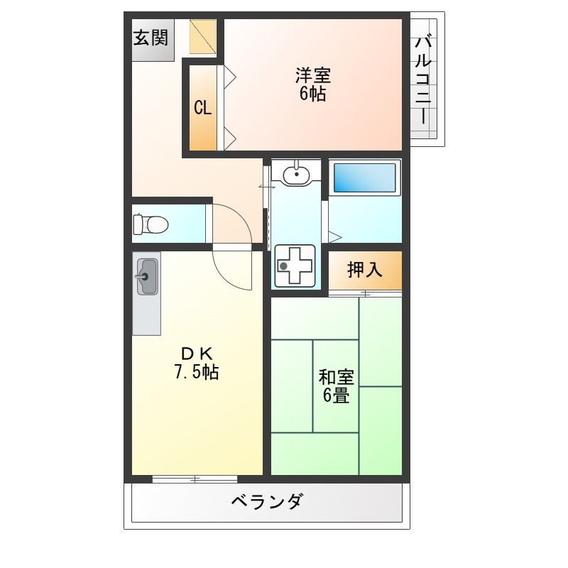 | 間取り詳細 | DK 7.5畳 、 洋室 6畳 、 和室 6畳 |