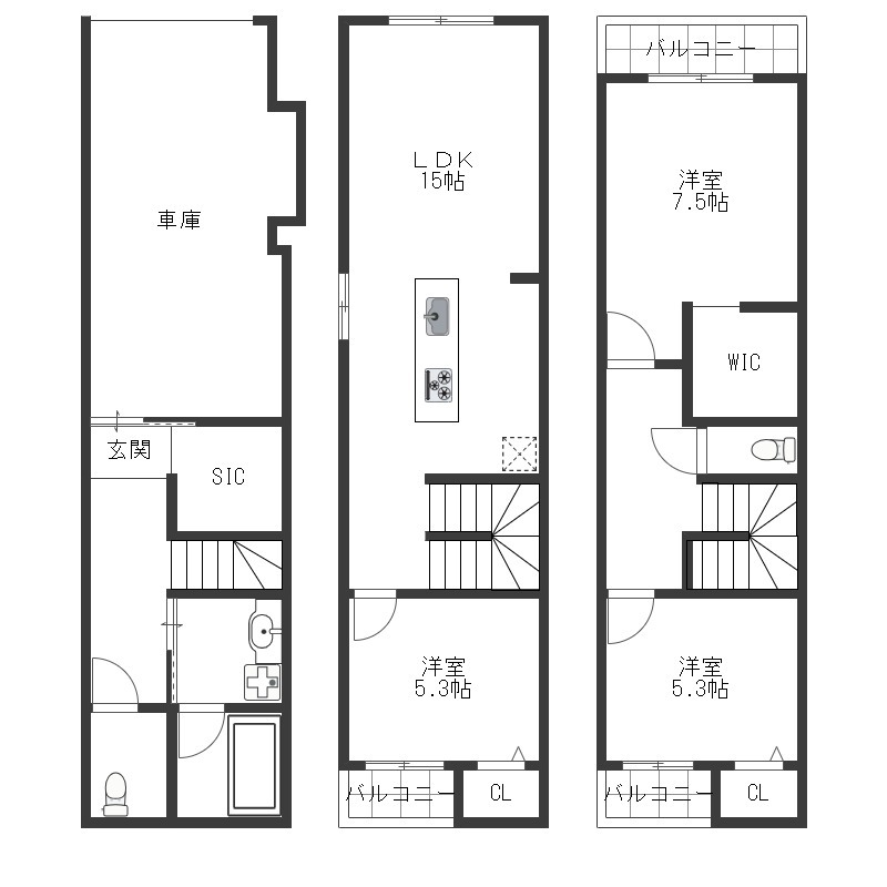 | 間取り詳細 | LDK 15畳 、 洋室 7.5畳 、 洋室 5.3畳 、 洋室 5.3畳 |