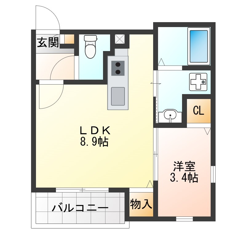 | 間取り詳細 | LDK 8.9畳 、 洋室 3.4畳 |