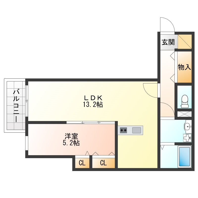 | 間取り詳細 | LDK 13.2畳 、 洋室 5.2畳 |