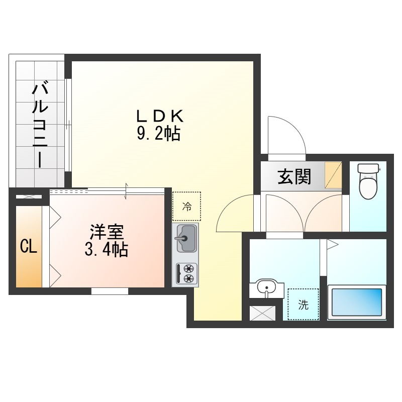 | 間取り詳細 | LDK 9.2畳 、 洋室 3.4畳 |