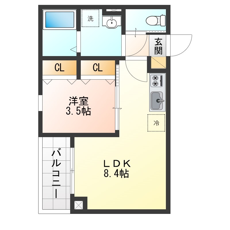 | 間取り詳細 | LDK 8.4畳 、 洋室 3.5畳 |