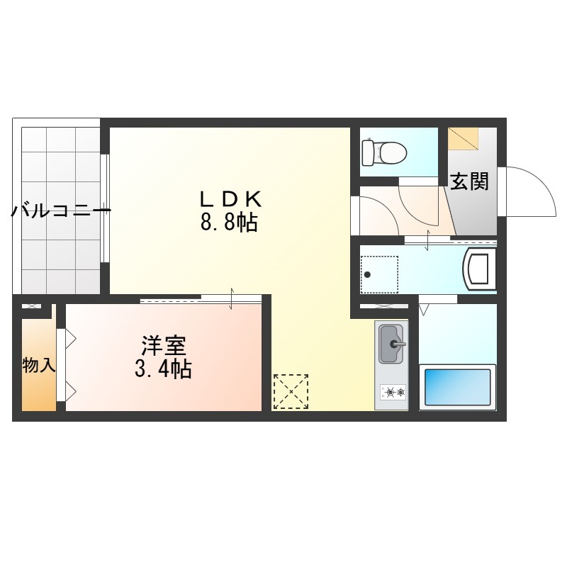 | 間取り詳細 | LDK 8.8畳 、 洋室 3.4畳 |