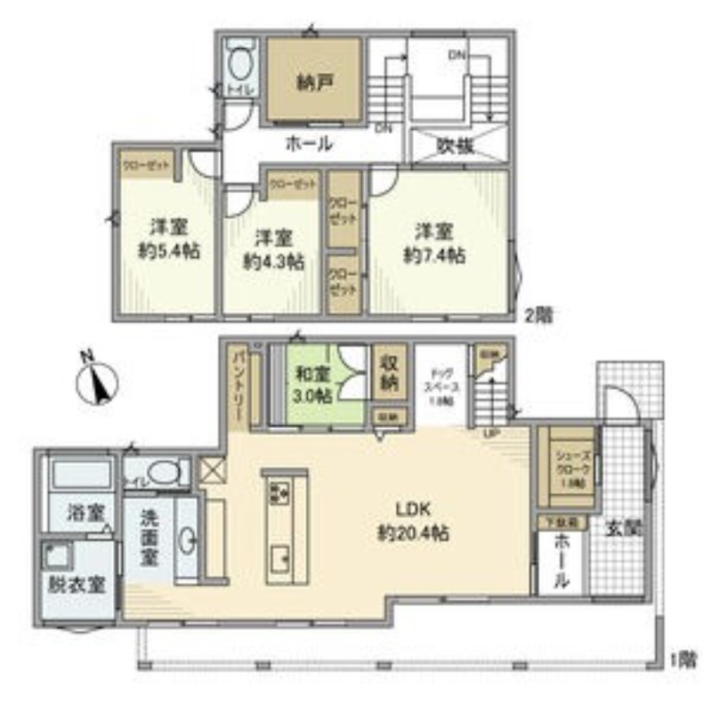 | 間取り詳細 | LDK 20.4畳 、 洋室 4.3畳 、 洋室 5.4畳 、 洋室 7.4畳 、 和室 3畳 |