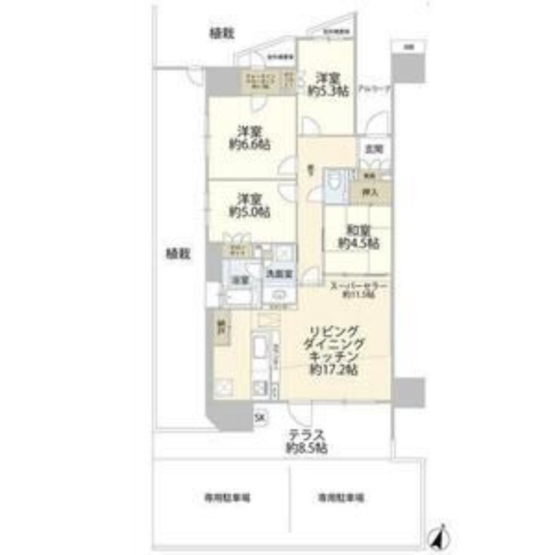 | 間取り詳細 | LDK 17.2畳 、 洋室 6.6畳 、 洋室 5.3畳 、 洋室 5畳 、 和室 4.5畳 |