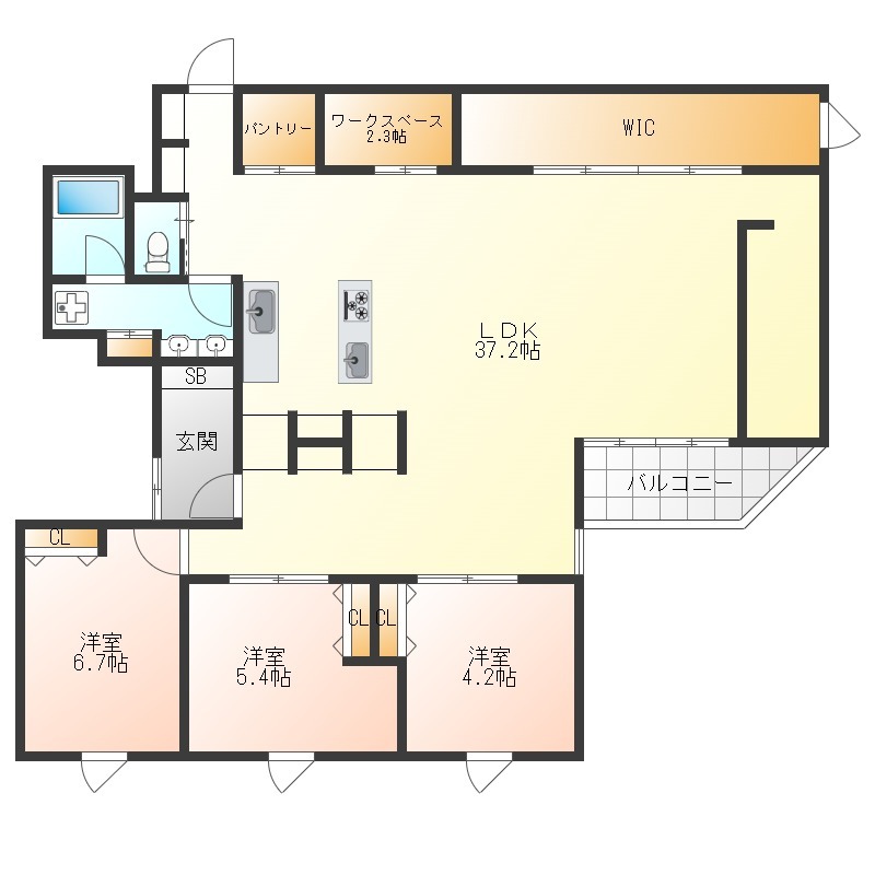 | 間取り詳細 | LDK 37.2畳 、 洋室 6.7畳 、 洋室 5.4畳 、 洋室 4.2畳 、 S 6畳 |