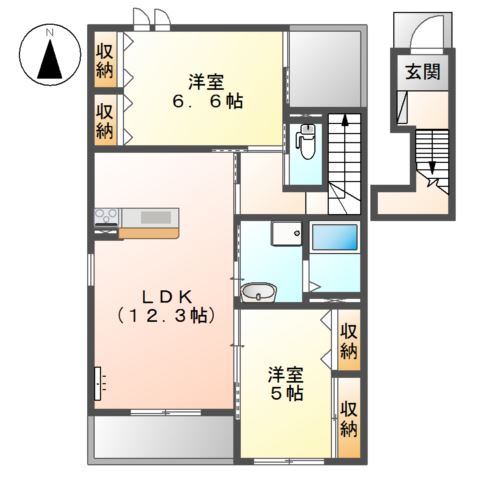 | 間取り詳細 | LDK 12.3畳 、 洋室 6.6畳 、 洋室 5畳 |