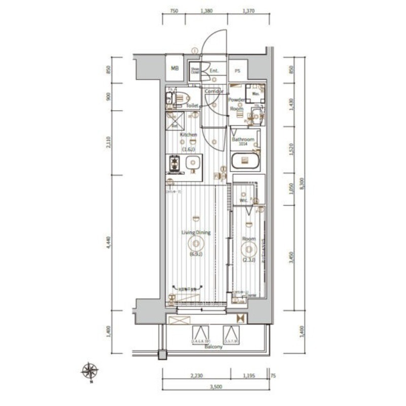 | 間取り詳細 | 洋室 2.3畳 、 LD 6.9畳 、 K 畳 |